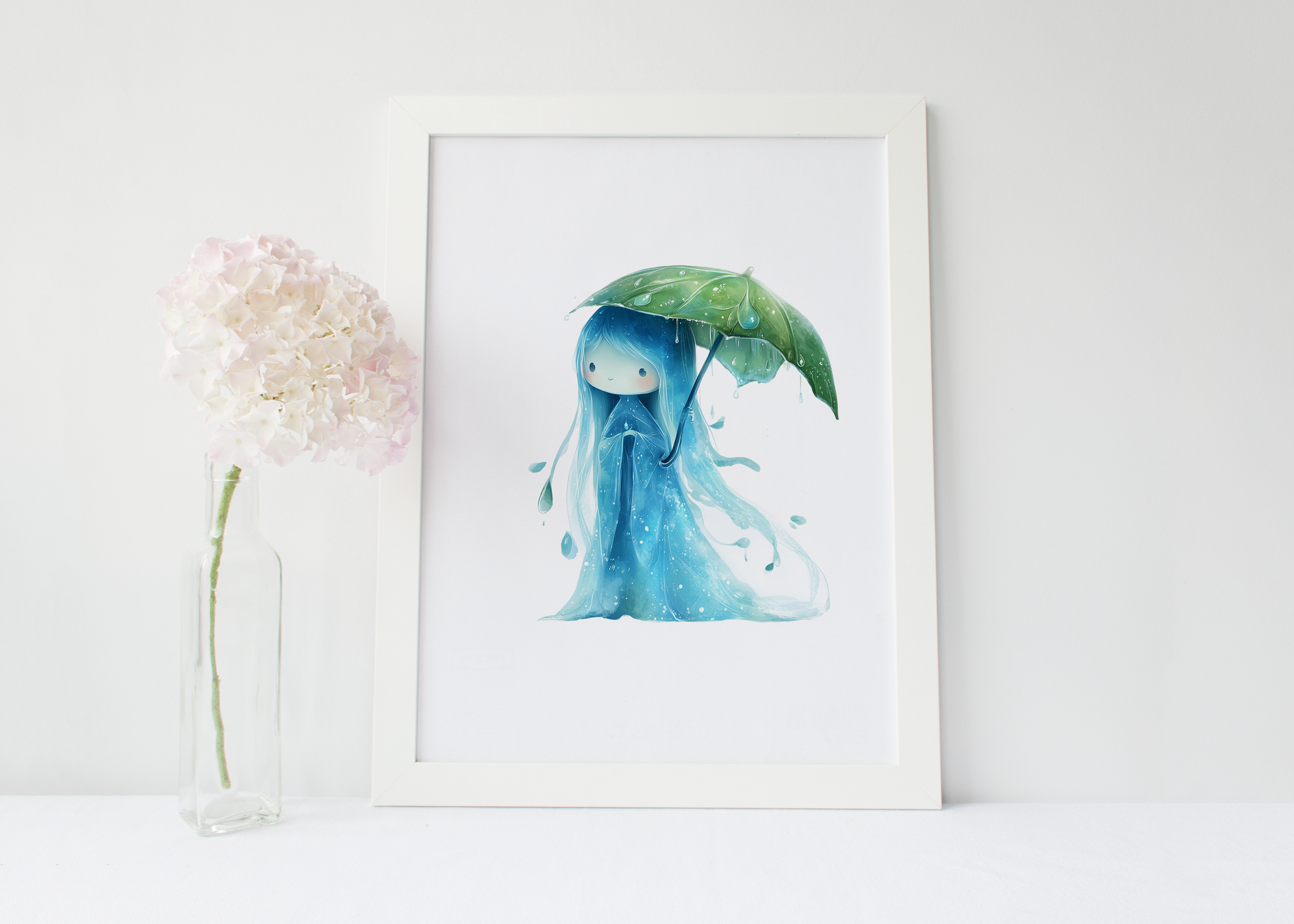 This adorable art print shows a gentle water spirit taking shelter under a large green leaf umbrella during a soft rain shower. The little character has flowing blue hair that seems to merge with water, simple dot eyes, and a peaceful expression. Her translucent blue dress appears to be made of water itself, with tiny sparkles and droplets throughout.