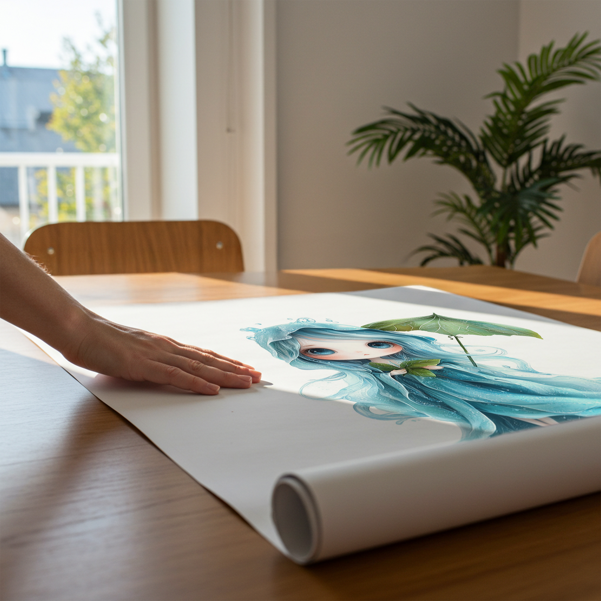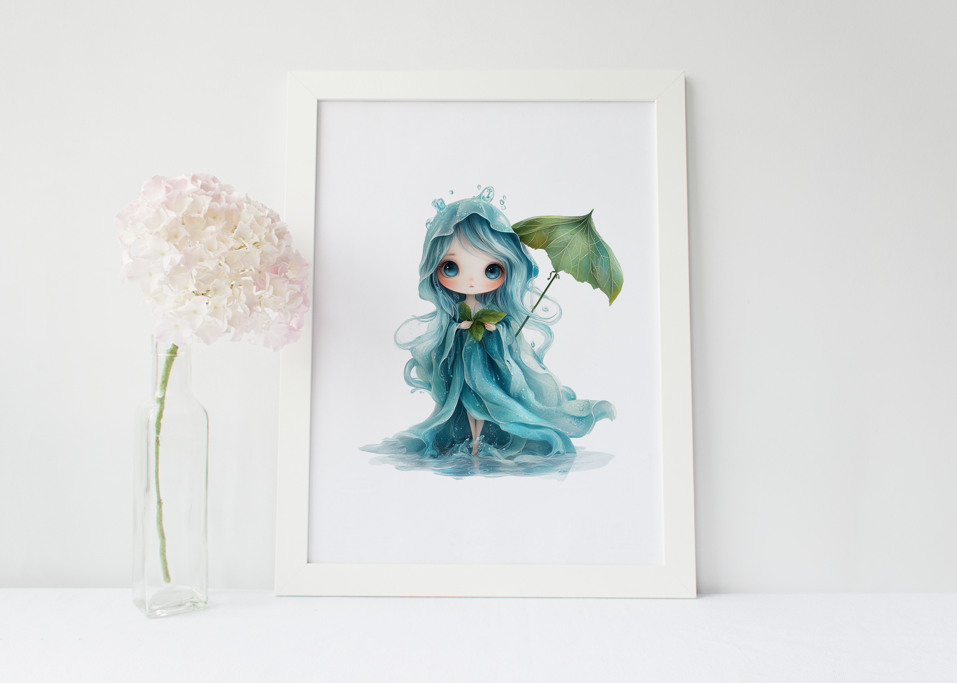 This enchanting art print features a sweet little water spirit with flowing aqua hair and big, sparkling eyes. She's wrapped in translucent water robes that seem to ripple and move, while holding a large green leaf umbrella. Tiny water droplets and bubbles dance around her as she stands in a shallow puddle.